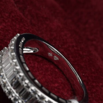 Here is a spectacular 1.51 carat half eternity ring, handcrafted in 18k white gold, with natural VS clarity diamond’s hand picked and placed with care in an arc of baguette-cut and round cut stones.